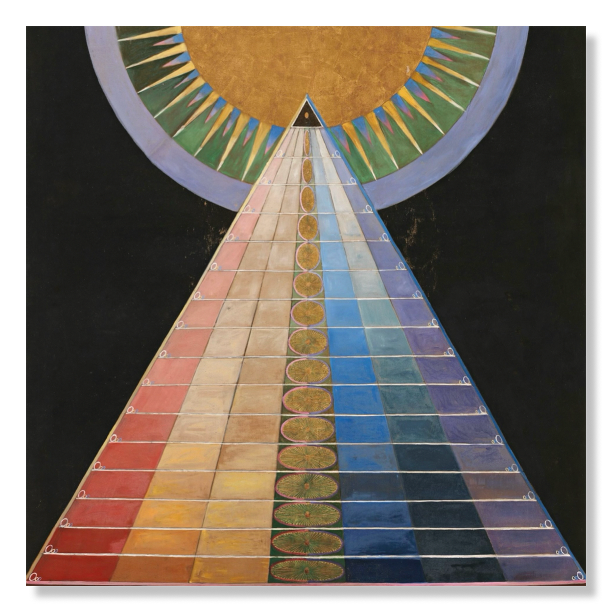 Hilma af Klint – Group X, No. 1 – Altarpiece (1915) on visio valosta, järjestyksestä ja yliaistillisesta harmoniasta. Tässä monumentaalisessa sommitelmassa geometrinen ja jumalallinen kohtaavat – symbolinen polku oivallukseen ja valaistumiseen.
