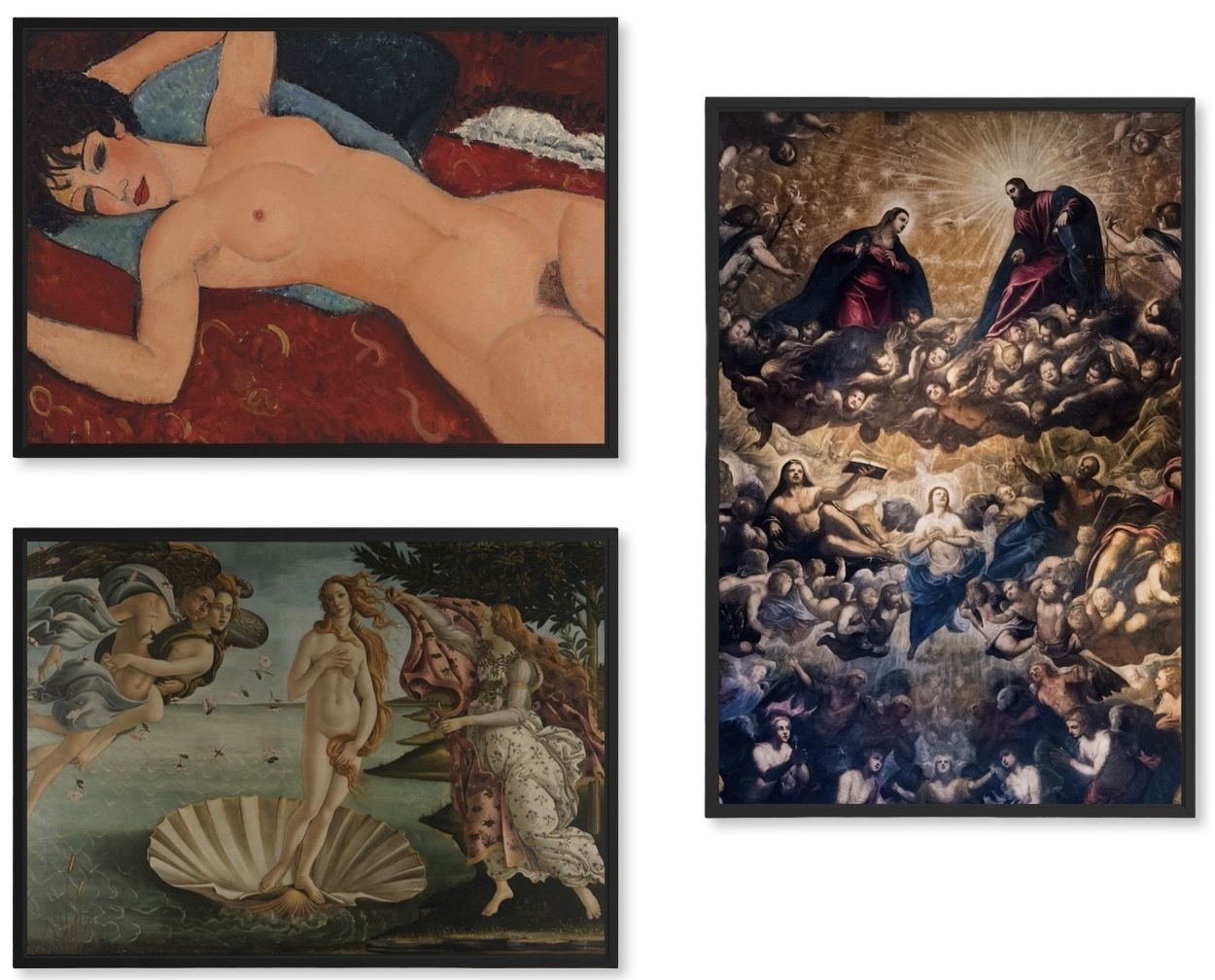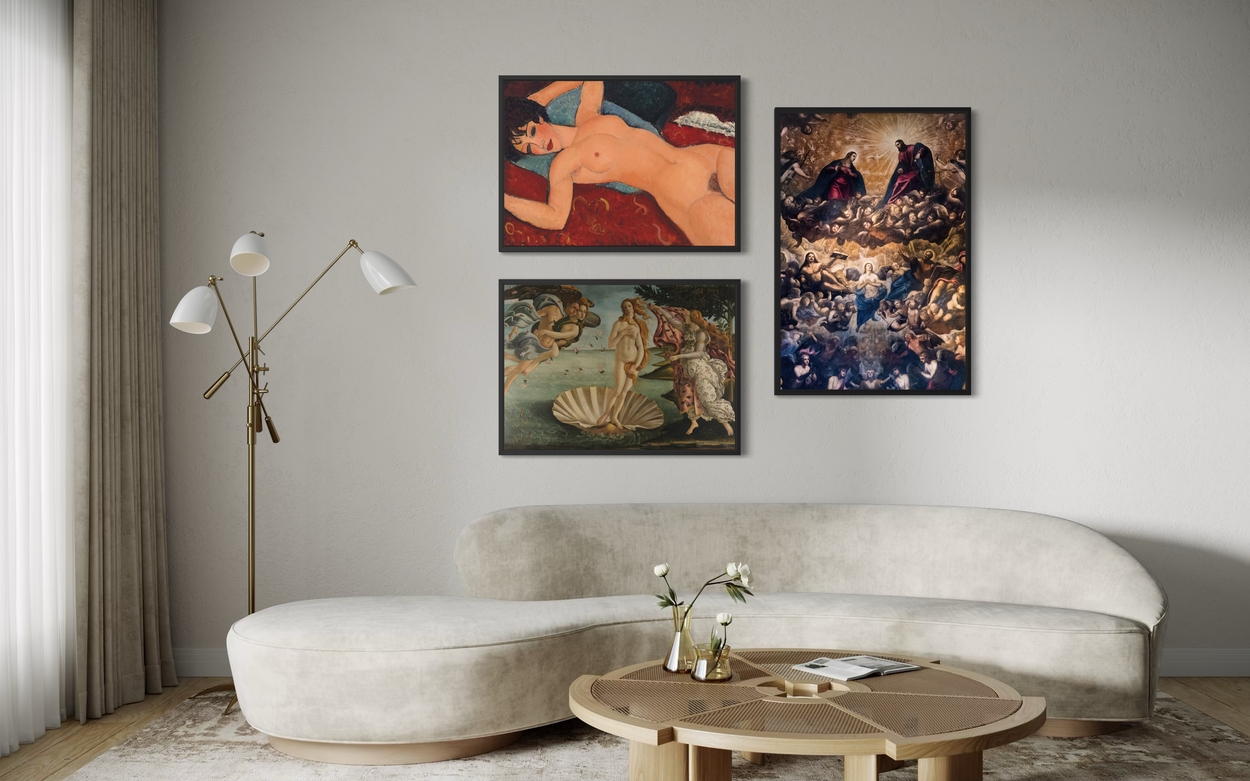 Eksklusiivinen trio osana Ajattomat Mestarteokset -kokoelmaa: Tintoretton taivaallinen visio, Botticellin mytologinen kauneus ja Modiglianin sensuelli läheisyys – painettuna kankaalle ja kehystettynä mustiin kelluviin kehyksiin tyylikkääseen galleriaesitykseen.