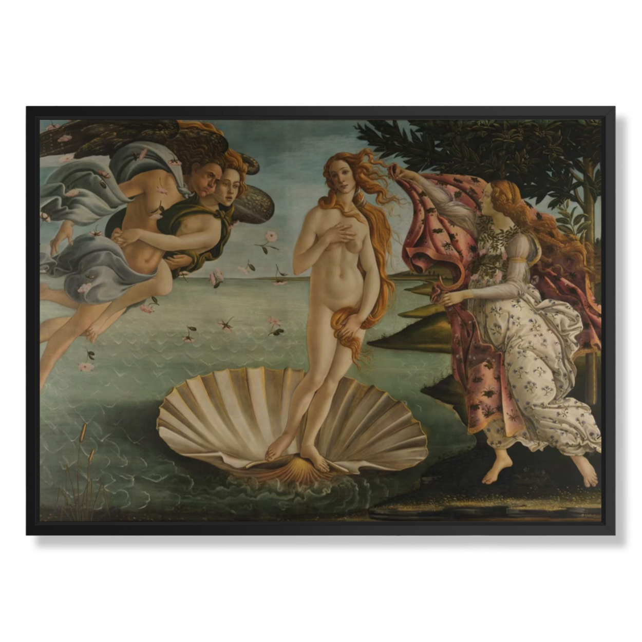 Sandro Botticelli – Nascita di Venere (n. 1485) kuvaa kauneuden syntymän meren vaahdosta – mytologisen kertomuksen, jossa Venus nousee esiin harmonian, ihanteiden ja elämän luovan voiman symbolina. Tässä ihmisen ja jumalallisen maailmat kohtaavat täydellisessä tasapainossa.